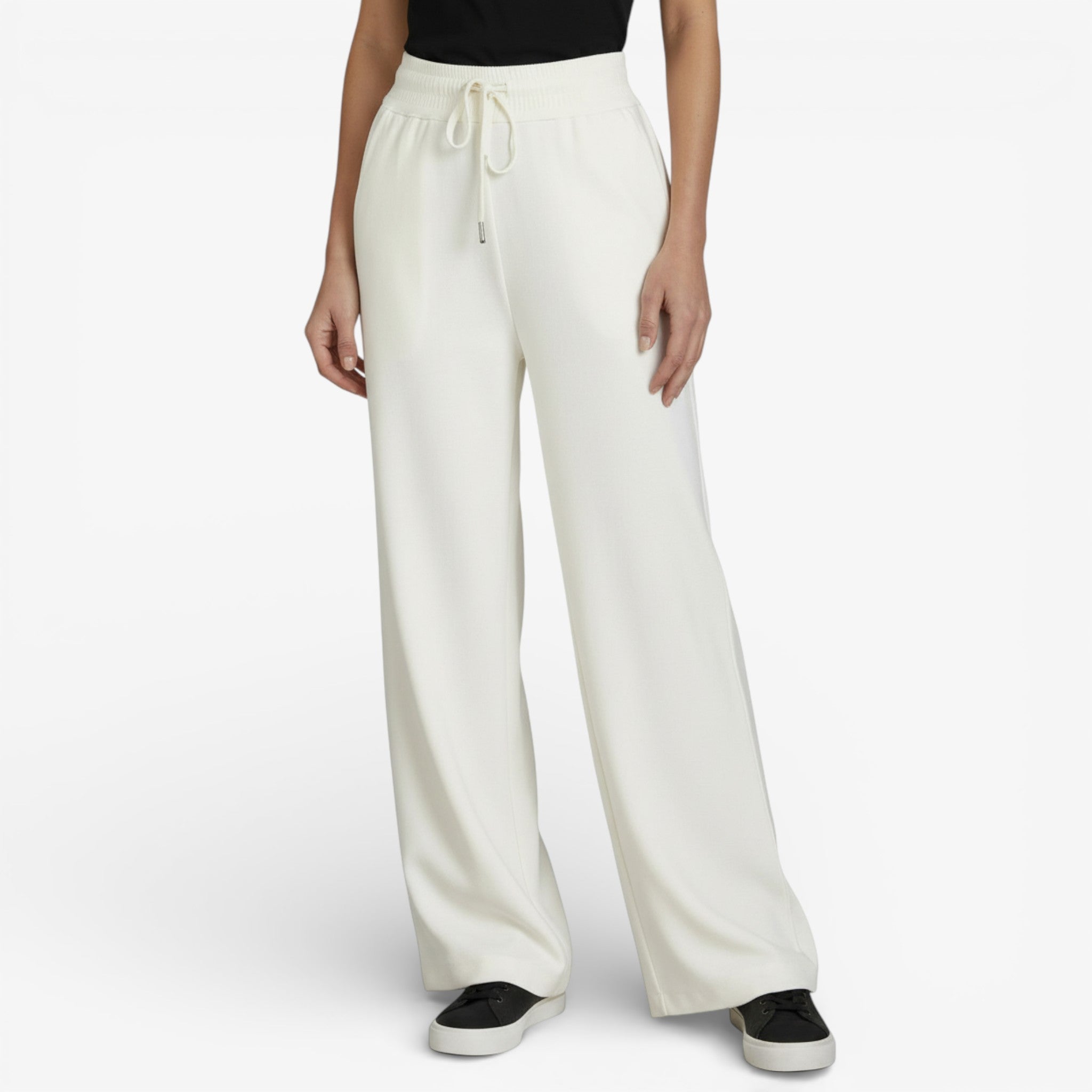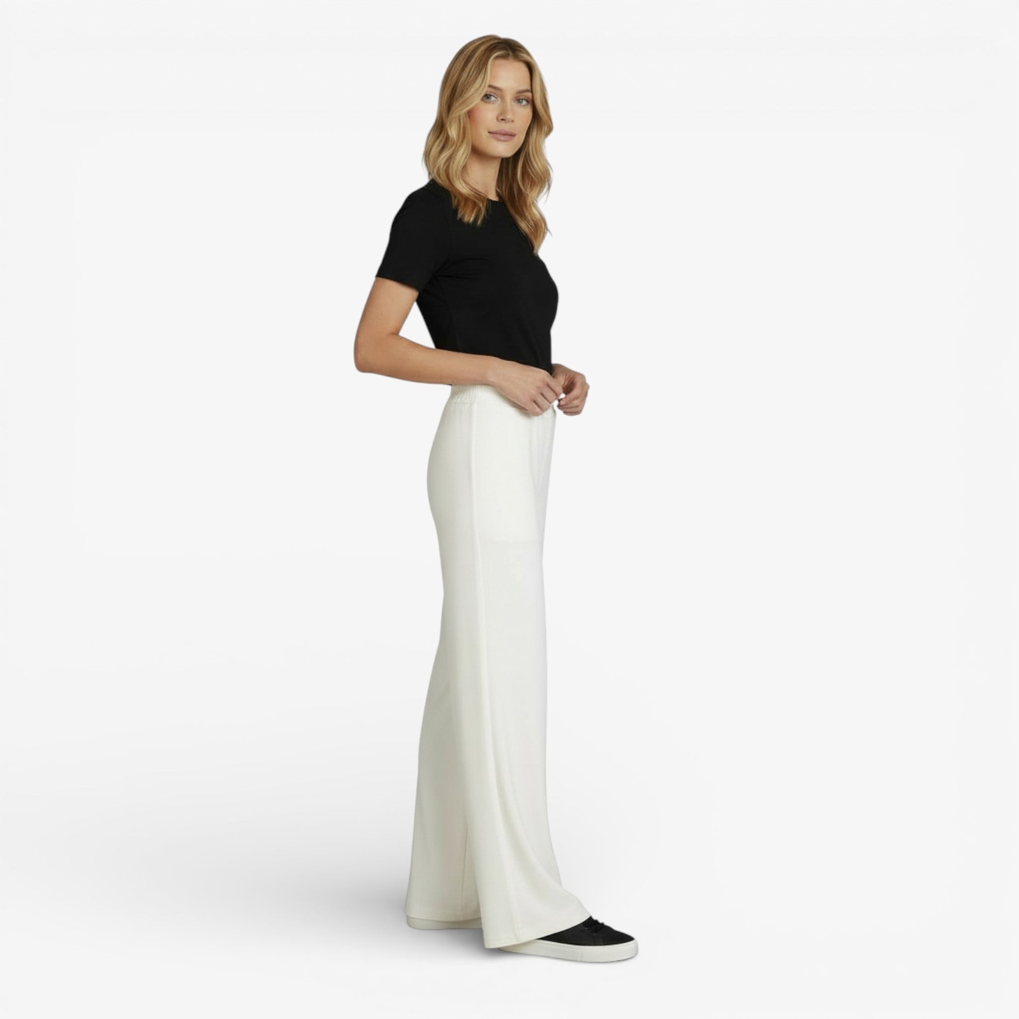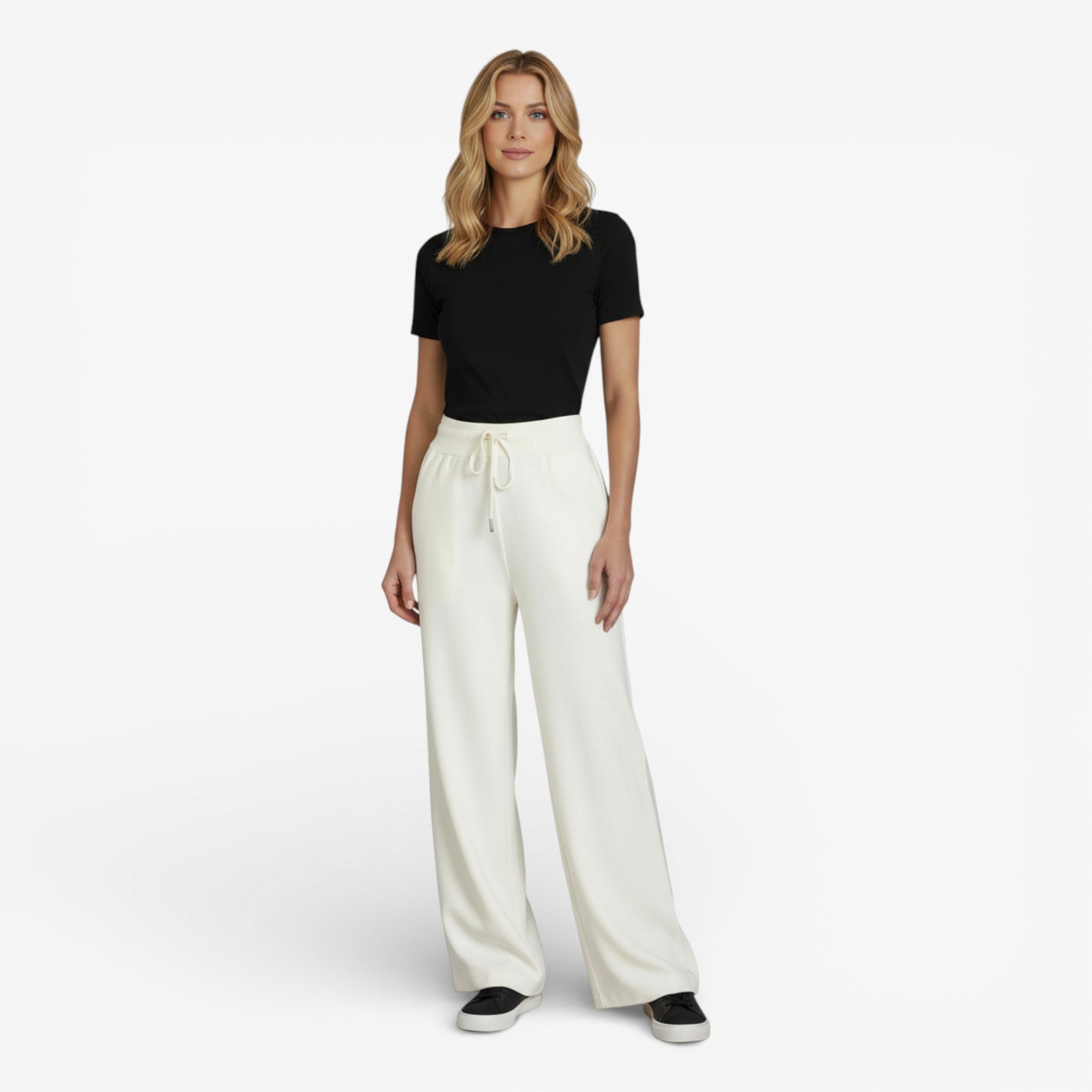 Oui. Le pantalon large est une coupe universelle qui s’adapte à toutes les silhouettes. Sa ligne fluide allonge la jambe et équilibre les proportions, que vous soyez petite, grande, fine ou avec des formes. Il apporte élégance et confort sans marquer la silhouette.