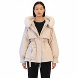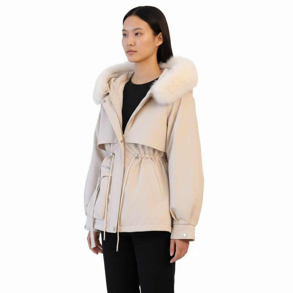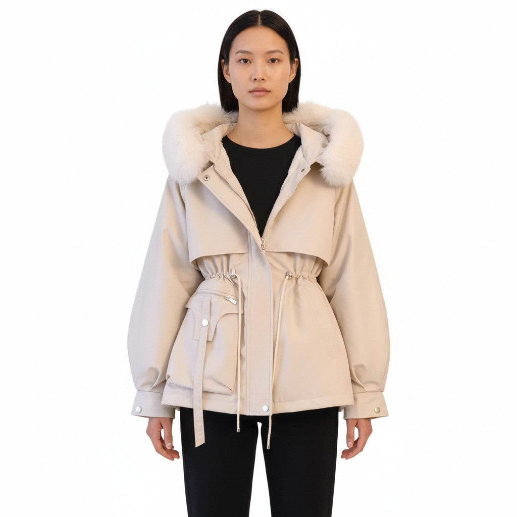 Diese kurze Jacke begeistert durch ihre anpassbare Taille dank eines Kordelzugs, der die Silhouette subtil betont. Ihr klares Design und die beige-cremefarbene Farbgebung bringen einen hellen Akzent in Ihre Wintergarderobe, während die mit Kunstfell verzierte Kapuze eine Note von Weichheit hinzufügt.